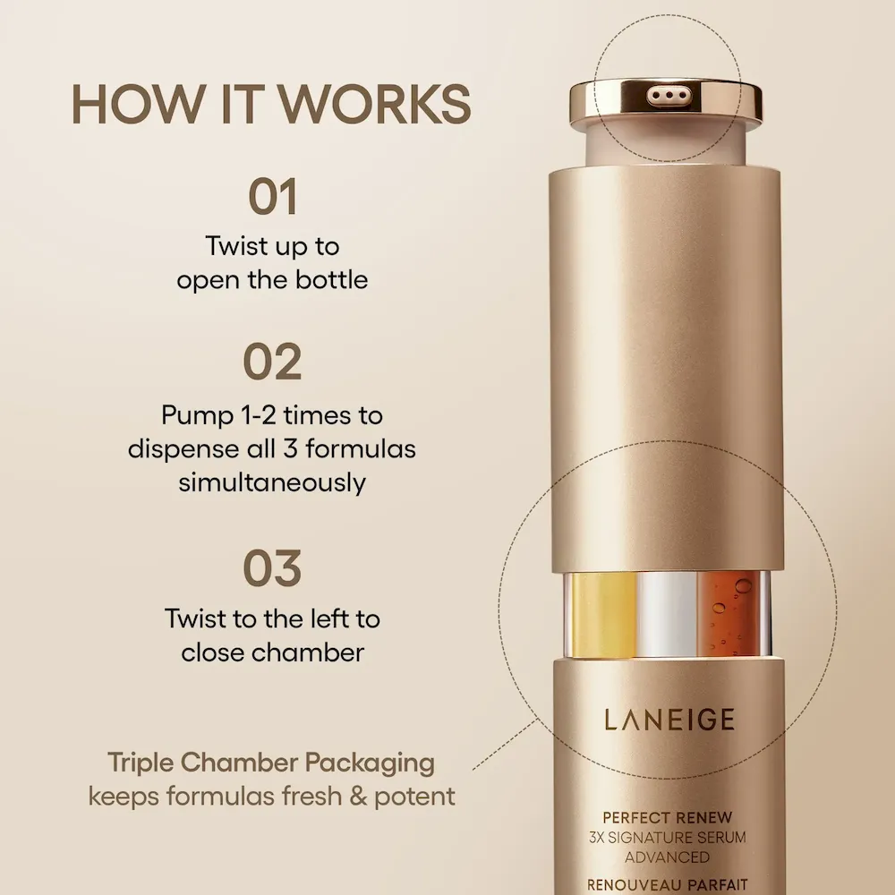 A triple threat treatment targeting 3 visible signs of aging. The 3 advanced serums are sealed in a unique triple-chamber packaging that blocks light when not in use so that actives stay potent for longer.